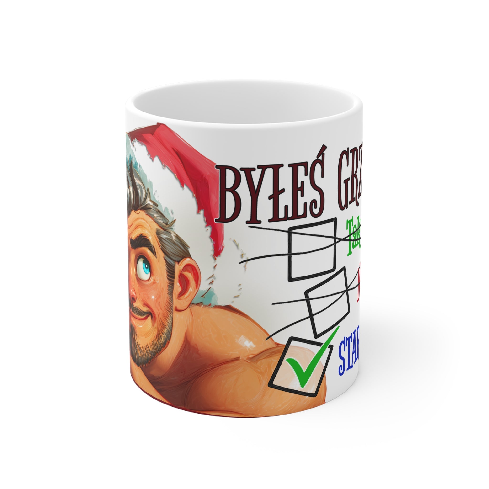 Niech te Święta będą nie tylko magiczne, ale też zabawne! 😄 Kubek „Byłeś grzeczny?” z przystojnym, figlarnym Mikołajem to idealny pomysł na prezent dla każdego, kto lubi żart i świąteczny luz.